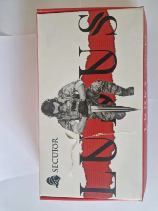 Pistola de la marca Secutor. - Diseño con figura de soldado. - Detalle de cuchillo.