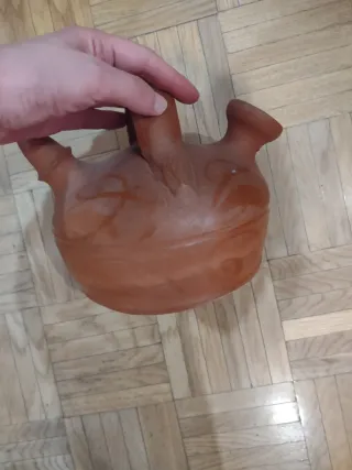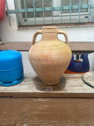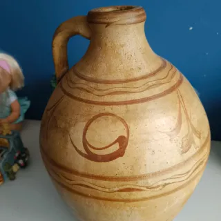 Cántaro de barro muy antiguo, con un diseño tradicional y un acabado rústico que evoca épocas pasadas. - Material: Barro. - Color: Tonos tierra y ocres. - Diseño: Dos asas y cuello estrecho. Comprado en anticuario hace más de 30 años.