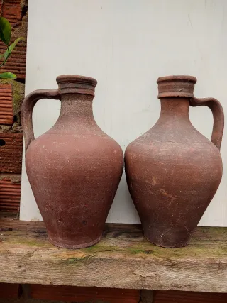 Conjunto de dos cántaros de barro, perfectos para decoración rústica o coleccionismo. (No hago envio por su fragilidad) - Material: Barro cocido. - Diseño tradicional con asa. - Color terracota.