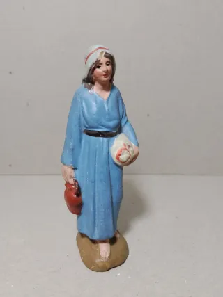 Figura artesanal para belén, elaborada en barro y terracota. 10cm de altura - Diseño de mujer con cántaro y cesto. - Tonos tierra y azul.