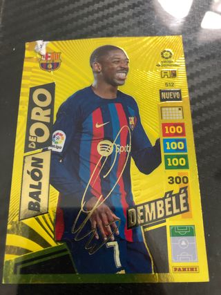 Carta de fútbol de Ousmane Dembélé, edición Balón de Oro de la temporada 2022-23. - Incluye firma dorada. - Número de carta: 512. - Categoría: Nuevo. - Puntuaciones: 100, 100, 100, 300. - Logo de LaLiga Santander y Panini.