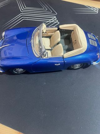 Réplica detallada de un coche clásico a escala 1:18. Sin ningún rasguño, siempre en vitrina de colección. No dispongo de caja del modelo, se envasaría muy bien con caja para transporte. - Color azul brillante. - Interior detallado con asientos y volante. - Capota de lona beige.