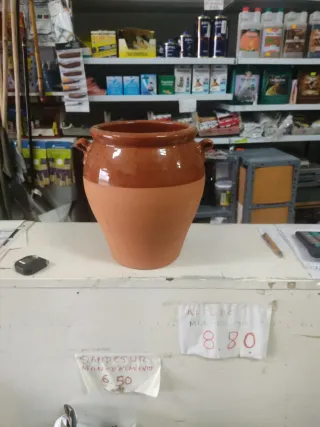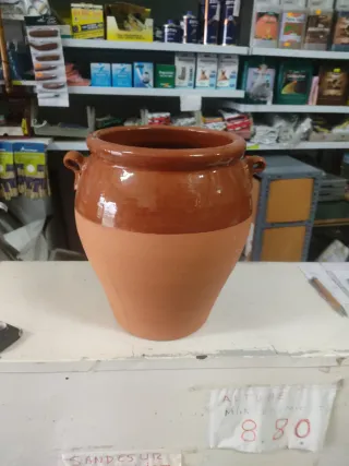 Tinaja de barro tradicional, ideal para decoración o uso alimenticios - Material: Barro cocido. - Color: Terracota con acabado esmaltado en la parte superior. - Diseño: Con dos asas laterales.altura 32 cm