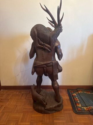 Impresionante escultura tallada a mano en madera maciza. - Representa a un cazador con un ciervo. - Incluye un perro a sus pies. - Base tallada en madera. - Pesa 16kg PRECIO NEGOCIABLE Al ciervo le falta una oreja, aparece en las fotos