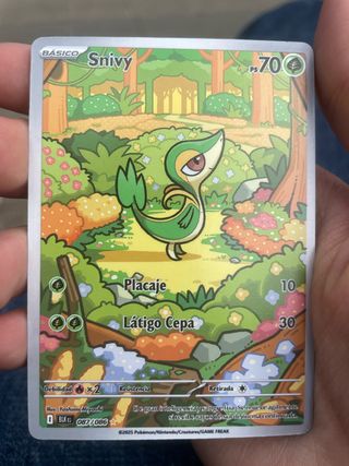 Carta Pokémon de Snivy, edición básica. - Número de carta: 087/086. - Ilustrador: Yoshimi Miyoshi. - PS: 70. - Ataques: Placaje y Látigo Cepa. - Debilidad: Fuego x2. - Resistencia: Ninguna. - Coste de Retirada: 1 Energía.