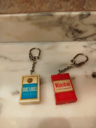 Conjunto de dos llaveros con forma de paquetes de cigarrillos en miniatura Coleccionismo años 70 Se abren las cajetillas, pegatinas perfectas nunca se han usado, bien guardadas También envíos por Wallapop Los dos 10€ - Llavero de Ducados. - Llavero de Winston Filter Cigarettes.