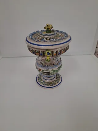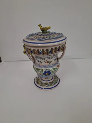 Precioso jarrón de cerámica de la marca Gimeno, con un diseño floral y un detalle de pájaro en la tapa. - Cerámica pintada a mano. - Motivos florales y vegetales. - Tapa con figura de pájaro. - Asas laterales.