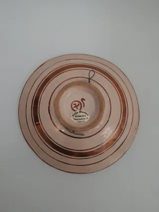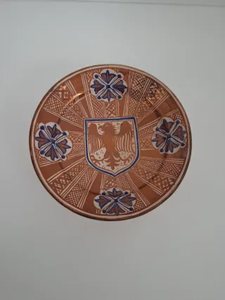 Plato decorativo de cerámica con reflejo, inspirado en el estilo de Manises. Presenta un diseño central con un águila heráldica. - Motivo central de águila. - Decoración con motivos florales y geométricos. - Tonos terracota y azul.