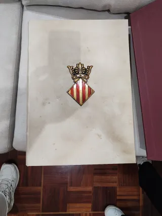 Libro sobre los privilegios de Valencia. - Portada con relieve de un caballero a caballo. - Encuadernación en tela color crema. Es una reproducción de un medallón conmemorativo del 750 aniversario del Reino de Valencia, posiblemente una réplica fiel en bronce de la pieza original. El medallón está montado en la cubierta de un libro, que podría ser un facsímil de "El Llibre dels Privilegis de Valencia". El medallón representa a un caballero a caballo, que es el emblema de la ciudad de Valencia. La reproducción original de bronce pesa aproximadamente 457 g y tiene un diámetro de 10 cm. El libro podría ser una copia del manuscrito q
