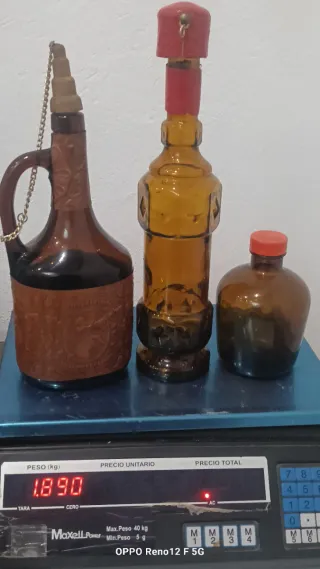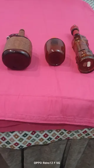 Conjunto de tres botellas de cristal, perfectas para coleccionistas o decoración. - Botella marrón con asa y detalle en relieve. - Botella alta de cristal ámbar con diseño facetado. - Botella pequeña de cristal ámbar con tapa naranja.