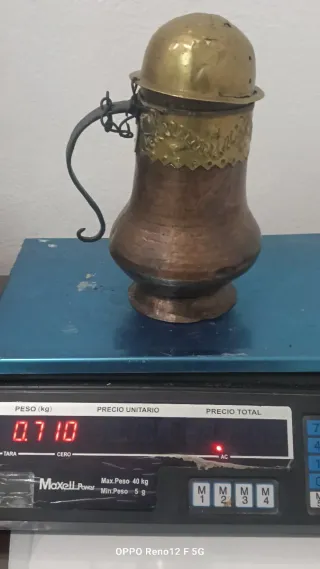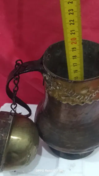 Pieza antigua decorativa de cobre, latón y forja. - Diseño artesanal. - Asa de forja. - Tapa de latón con detalles. - Cuerpo principal de cobre martillado.