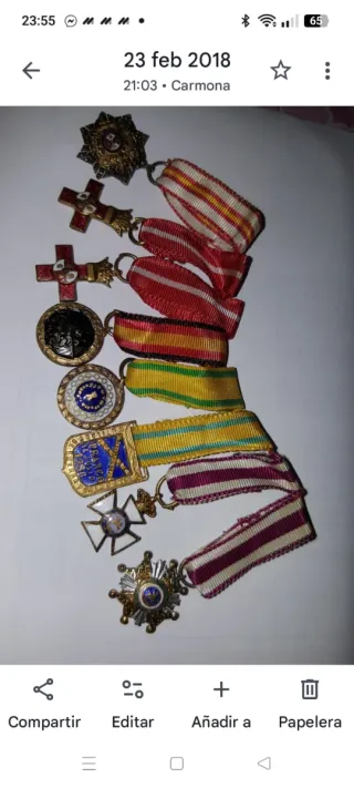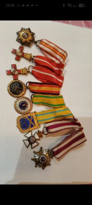 Conjunto de 8 medallas militares antiguas, unidas en un pasador. - Diseño variado con cintas de diferentes colores y esmaltes. - Incluye cruces y estrellas. - Piezas con detalles históricos.
