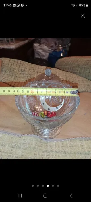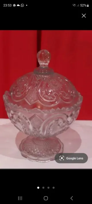 Elegante bombonera antigua de cristal tallado con tapa. - Diseño intrincado y detallado. - Base con pie para mayor presencia. - Pieza decorativa clásica.