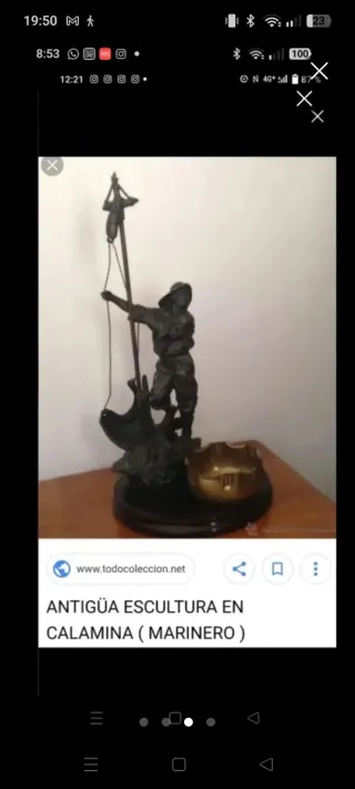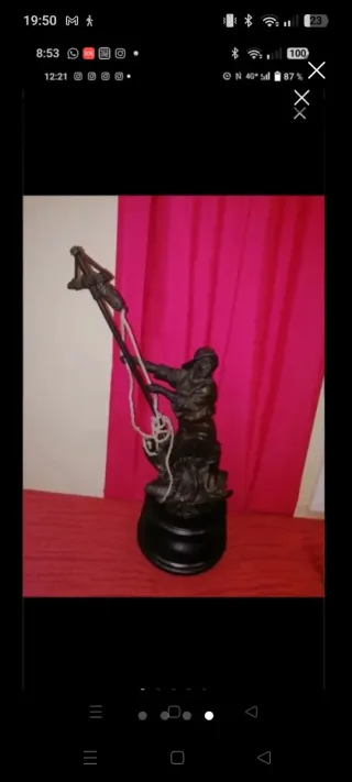 Bonita escultura de coleccionista que representa a un pescador. El pedestal es de madera y está restaurado - Material: Calamina. - Detallada figura de pescador con aparejos.
