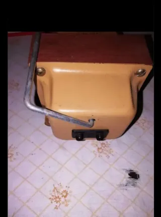 Transformador de corriente antiguo con una capacidad de 400 VA. - Carcasa de color beige. - Núcleo central de color rojo. - Soporte metálico superior.