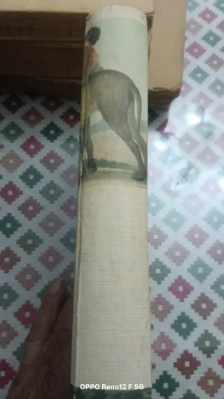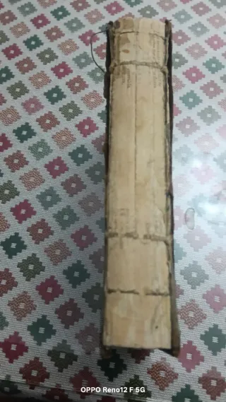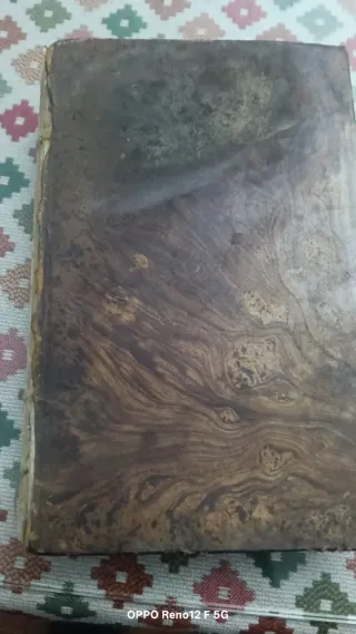 Libro antiguo con encuadernación en tapa dura. - Cubierta con textura y diseño de madera. - Bordes desgastados por el paso del tiempo.