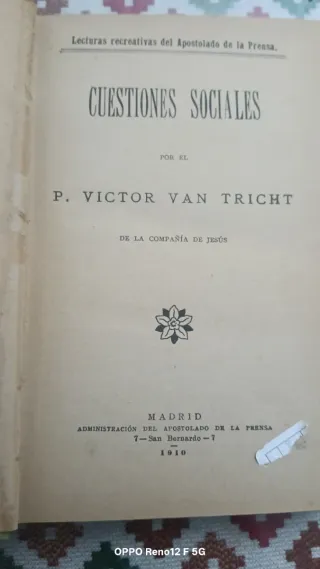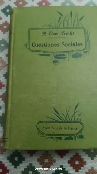 Libro antiguo con el título Cuestiones Sociales de P. Van Tricht. - Tapa dura de color verde. - Ilustraciones de cañas y nenúfares.
