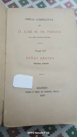 Conjunto de obras completas de D. José M. de Pereda, Tomo XV. - Título: Peñas Arriba - Tercera Edición - Publicado en Madrid por Viuda é Hijos de Manuel Tello en 1901.