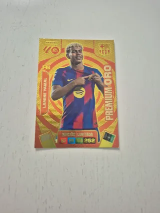 Carta de colección de Lamine Yamal, edición limitada. - Diseño Premium Oro. - Incluye escudo del FC Barcelona y logo de Panini. - Número de carta: 252.
