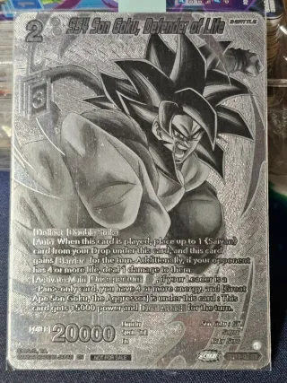 Carta de Torneo Dragon Ball Super, SS4 Son Goku, Defender of Life. - Carta de batalla 2. - Poder: 20000. - Habilidad: Deflect Double Strike. - Incluye texto de habilidad 'Auto' y 'Activate:Main'. - Edición especial 'NOT FOR SALE'.