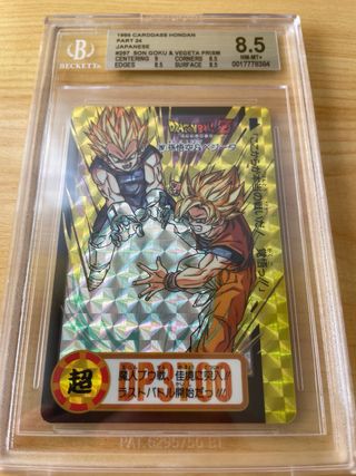 Carta coleccionable de Dragon Ball Z, modelo Carddass Prism de Bandai, con certificación Beckett. - Número de carta: #297 Son Goku & Vegeta Prism. - Año: 1995. - Serie: Carddass Hondan Part 24. - Idioma: Japonés. - Calificación Beckett: 8.5 NM-MT+. - Puntuaciones individuales: Centering 9, Corners 8.5, Edges 8.5, Surface 8.5. - Código de autenticidad: 0017778384.