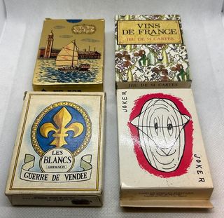 Conjunto de cuatro barajas de cartas, dos de origen francés y dos de origen español. - Baraja Vins de France (Jeu de 54 Cartes). - Baraja Les Blancs (Guerre de Vendée) de Grimaud. - Baraja con diseño de Joker. - Baraja con escena de puerto y velero.