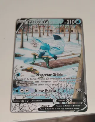 Carta Pokémon de Glaceon V, edición en español. - Número de carta: 175/203. - Ilustración de Narumi Sato. - Ataque: Despertar Gélido. - Habilidad: Nieve Espesa. - Regla V.