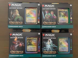 NO VENDO POR SEPARADO. Regalazo para fans de El Señor de los Anillos y de las cartas Magic. PAck compuesto por los 4 mazos de Magic de Commander de El Señor de los anillos en inglés. Nuevos, sin estrenar, en cajas precintadas. Cada mazo incluye además un sobre de coleccionista en inglés con dos cartas con diseño alternativo. Se envía en caja rígida de cartón para que vayan protegidos. Tales of Middle Earth. Del juego magic the gathering mtg esdla lotr Lord of the Rings. Perfecto regalo para Navidad o cumpleaños para fans de cartas magic y el Señor de los Anillos.