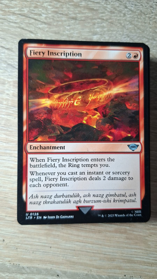 Carta de Magic: The Gathering, Fiery Inscription. - Tipo: Encantamiento. - Coste de maná: 2. - Efecto: Cuando entra al campo de batalla, el Anillo te tienta. Cada vez que lances un hechizo de instantáneo o conjuro, Fiery Inscription inflige 2 puntos de daño a cada oponente. - Idioma: EN (Inglés). - Ilustrador: John Di Giovanni. - Colección: LTR (El Señor de los Anillos: Relatos de la Tierra Media).