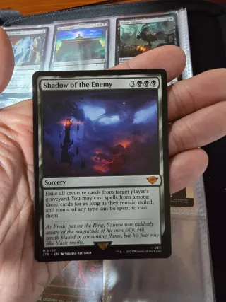 Vendo la carta Shadow of the Enemy (Sombra del Enemigo) de la colección Tales of Middle-earth (LTR). Es una carta de rareza Mítica ideal para mazos de Commander negros que busquen aprovechar el cementerio del oponente. El estado es Near Mint (NM). Nombre: Shadow of the Enemy Edición: El Señor de los Anillos: relatos de la Tierra Media Idioma: Inglés (EN) Estado: Impecable, nunca jugada. Rareza: Mítica Posibilidad de entrega en mano en Galicia. Acorde por chat. #MTG #MagicTheGathering #Commander #EDH #LTR #CartasMagic