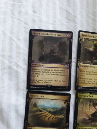 Lote de 6 cartas de Magic The Gathering. En inglés lord of the rings, señor de los anillos, holiday release - March from the Black Gate - Rosie Cotton of South Lane - Bilbo, Retired Burglar - Shire Terrace - Peregrin Took - Hithlain Knots