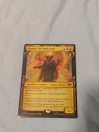Carta de Magic: The Gathering de Sauron, Señor de los Anillos. - Tipo: Criatura Legendaria - Avatar Horror. - Coste de maná: 5, azul, negro, rojo. - Poder/Resistencia: 9/9. - Habilidad: Al lanzar este hechizo, amasa Orcos 5, muele cinco cartas, luego regresa una carta de criatura de tu cementerio al campo de batalla. - Arrollar. - Habilidad adicional: Cada vez que un comandante que controla un oponente muere, el Anillo te tienta.