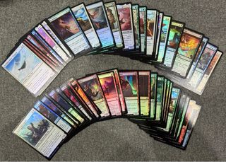 Conjunto de tierras básicas foil del set Adventures in the Forgotten Realms para Magic: The Gathering. Incluye todas las cartas mostradas en la foto: - Al menos una carta foil de cada versión de tierras de tipo Plains, Island, Swamp, Forest y Mountain. - Además agregó un lote de tierras no foil