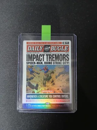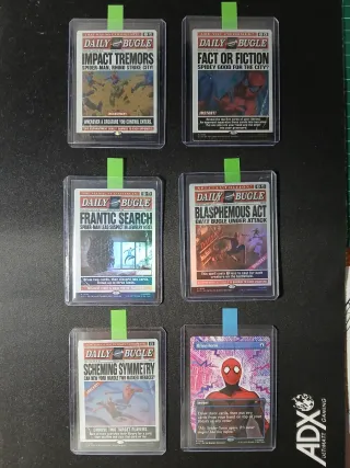 Conjunto de cartas de Magic: The Gathering del Secret Lair x Marvel's Spider-Man foil. - Incluye las cartas Impact Tremors, Fact or Fiction, Frantic Search, Blasphemous Act, Scheming Symmetry y Brainstorm. - Diseño inspirado en Spider-Man y el Daily Bugle.