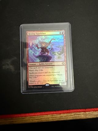 Carta de Magic: The Gathering, Hexing Squelcher, de la expansión Lorwyn Eclipsed. Es una carta foil. - Tipo: Criatura - Goblin Hechicero - Coste de maná: 1R - Poder/Resistencia: 2/2 - Habilidad: Este hechizo no puede ser contrarrestado. Salvaguarda — Paga 2 vidas. - Habilidad: Los hechizos que controlas no pueden ser contrarrestados. - Habilidad: Otras criaturas que controlas tienen «Salvaguarda — Paga 2 vidas».