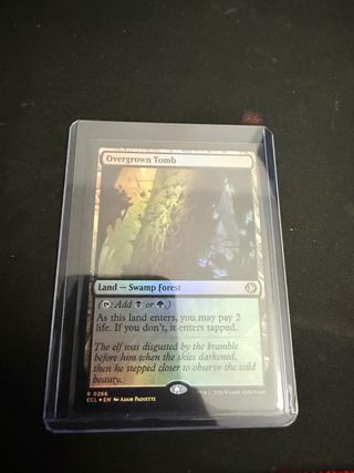 Carta de Magic: The Gathering, Overgrown Tomb, edición Lorwyn Eclipsed. - Es una carta foil (brillante). - Tipo de carta: Tierra - Bosque Pantano. - Habilidad: Puede añadir o . - Coste de entrada: Pagar 2 vidas o entra girada.