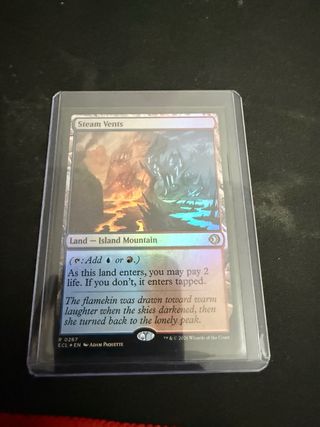 Carta de Magic The Gathering, Steam Vents, edición FOIL. - Tipo: Tierra - Isla Montaña. - Habilidad: Al entrar, puedes pagar 2 vidas. Si no lo haces, entra girada. - Arte por Adam Paquette. - Impresa en 2020.
