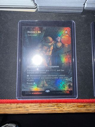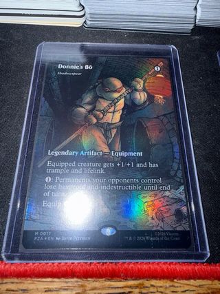 Carta de Magic: The Gathering, Donnie's Bo (Shadowspear). Es una carta foil en perfecto estado (NM). - Tipo: Artefacto Legendario - Equipo. - Habilidad: Otorga +1/+1, arrollar y vínculo vital a la criatura equipada. - Habilidad adicional: Permite que los permanentes de los oponentes pierdan hexproof e indestructible hasta el final del turno. - Coste de equipar: 2. - Arte: David Petersen. - Año: 2020.