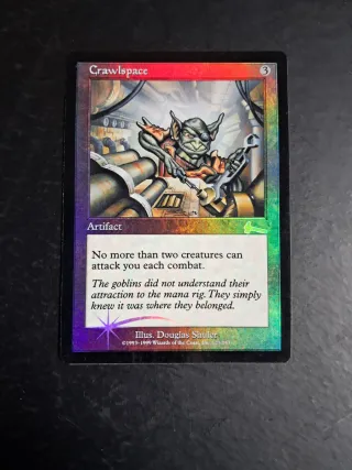 Parte delantera NM parte trasera GD Carta de Magic: The Gathering, Crawlspace, de la expansión Legado de Urza. Edición foil en inglés. - Tipo: Artefacto. - Coste de maná: 3. - Texto de habilidad: No más de dos criaturas pueden atacarte cada combate. Los trasgos no entendieron su atracción por la máquina de maná. Simplemente sabían que era donde pertenecían. - Ilustración: Douglas Shuler. - Código: 123/143.