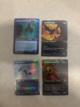 Lote de 4 cartas de Magic: The Gathering de la expansión El Señor de los Anillos: Cuentos de la Tierra Media (Tales of Middle-earth), todas en acabado foil. - Elrond, Lord of Rivendell - Dunland Crebain - Mirkwood Bats - Quickbeam, Upstart Ent,
