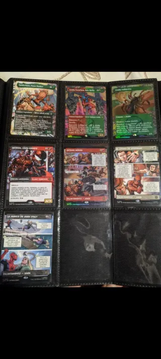 Colección de cartas de Magic: The Gathering con temática de Spiderman, estilo full art (comic-viñeta y estilo lanzaredes). A 10 euros la unidad (Spiderman simbionte 12), 14 las foils. Hay: - Seda, tejeredes - Araña corazón arácnido - Araña radiactiva foil - Araña escarlata foil - La saga del clon - La última cacería de kraven (foil) - La muerte de Gwen Stacy - La muerte de Gwen stacy (foil) - Gata negra, ladrona astuta - Spiderman simbionte