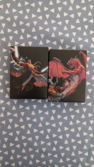 Mazos del pack de inicio de Magic de 2022. Perfecto estado, no habré jugado más de 5 partidas. Incluye algunas cartas de sobres sueltos que compré en su día. Claves para añadir las cartas al juego online sin usar.