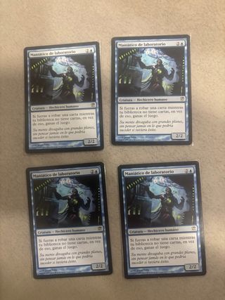 Conjunto de cuatro cartas Maniático de Laboratorio del juego Magic: The Gathering. - Cada carta es de tipo Criatura - Hechicero humano. - Poder/Resistencia: 2/2. - Idioma: Español