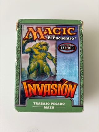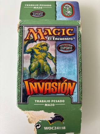MTG Magic el encuentro, Edicion Invasión, mazo Trabajo Pesado verde-blanco preparado de 60 cartas. Perfectamente conservado en español. Caja deteriorada como se ve en la foto. Compuesto de: -11 bosques -11 llanuras -2 tierras -13 criaturas blancas -10 criaturas verdes -5 criatiras doradas -8 encantamientos