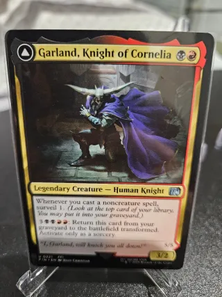 Carta de Magic: The Gathering, Garland, Caballero de Cornelia. - Tipo: Criatura Legendaria - Caballero Humano. - Coste de maná: 1 negro, 1 rojo, 1 blanco. - Habilidad: Surveil 1 al lanzar hechizos no criatura. - Habilidad activada: 3 negro, 3 rojo, 3 blanco: Transforma esta carta. - Poder/Resistencia: 3/2. - Ilustrador: Billy Christian.