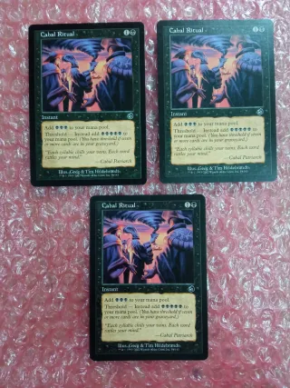 Lote de tres cartas de Cabal Ritual de Magic: The Gathering en muy buen estado. - Tipo: Instantáneo. - Coste de maná: 1B. - Habilidad: Umbral (Threshold).