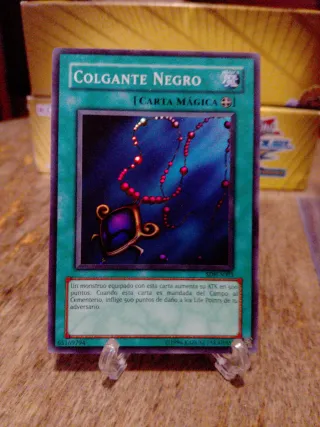 Carta mágica de Yu-Gi-Oh! llamada Colgante Negro. Super rara - Aumenta el ATK de un monstruo equipado en 500 puntos. - Si esta carta es enviada del Campo al Cementerio, inflige 500 puntos de daño a los Life Points del adversario. - Código de carta: SDH-S003 - Número de carta: 65169794