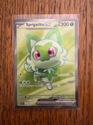 Carta Pokémon de Sprigatito ex de la expansión Ascended Heroes. - Tipo: Básico - Ataque 1: Arañazo (20 puntos de daño) - Ataque 2: Hoja Mágica (Cura 30 puntos de daño) - Debilidad: x2 - Resistencia: No especificada - Costo de Retirada: 1 energía - Ilustrador: Sban Graphics - Número de carta: 251/217