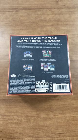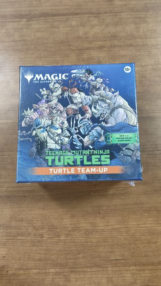 Juego de cartas Magic: The Gathering con temática de las Tortugas Ninja. - Edición especial Turtle Team-Up. - Incluye modo de juego cooperativo para 2-4 jugadores. - Apto para mayores de 13 años.