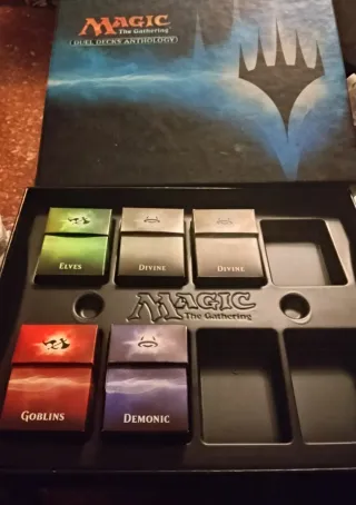Caja vacía de Magic: The Gathering - Duel Decks Anthology, junto con 5 DeckBox, separadores de cartas, 20 fundas oficiales personalizadas y 42 fundas negras estándar - Caja principal Duel Decks Anthology. - DeckBox específicas: - Divine (x2) - Demonic - Elves - Goblins - Separadores baraja - 42 fundas negras (ProDeck) - 20 fundas con los cuernos de Nicol Bolas